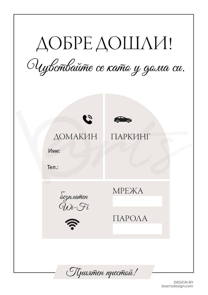 Разпечатете файла, попълнете собственоръчно информацията и поставете в рамка! Вашите гости ще бъдат очаровани от първия момент, в който прекрачат прага на Airbnb дома ви. С елегантни и функционални табелки, не само ще създадете усещане за топло посрещане, но и ще им предоставите цялата важна информация, от която се нуждаят:
