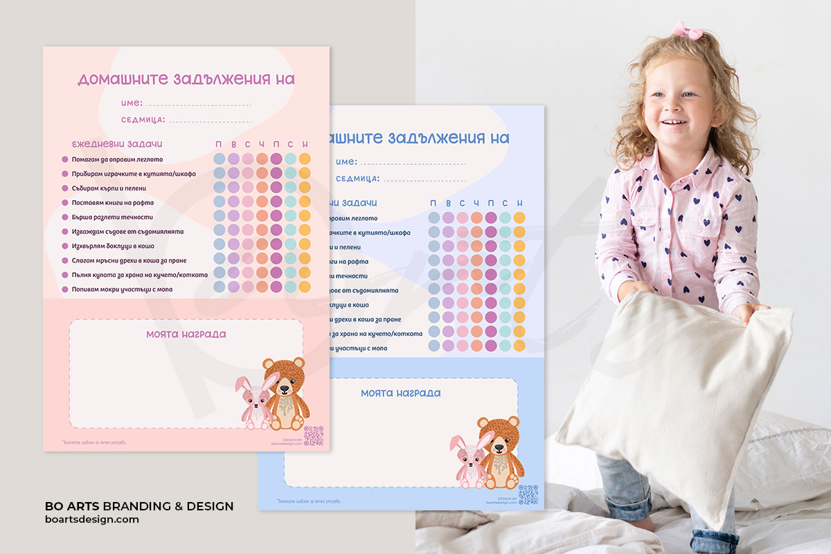 🧸 За всяка задача има място, където да отбележите дните от седмицата, в които детето е изпълнило задълженията си. А за допълнителна мотивация, в края на списъка има поле „Награда“. Там можете да опишете или нарисувате как ще бъде възнаградено вашето дете за добре свършената работа.