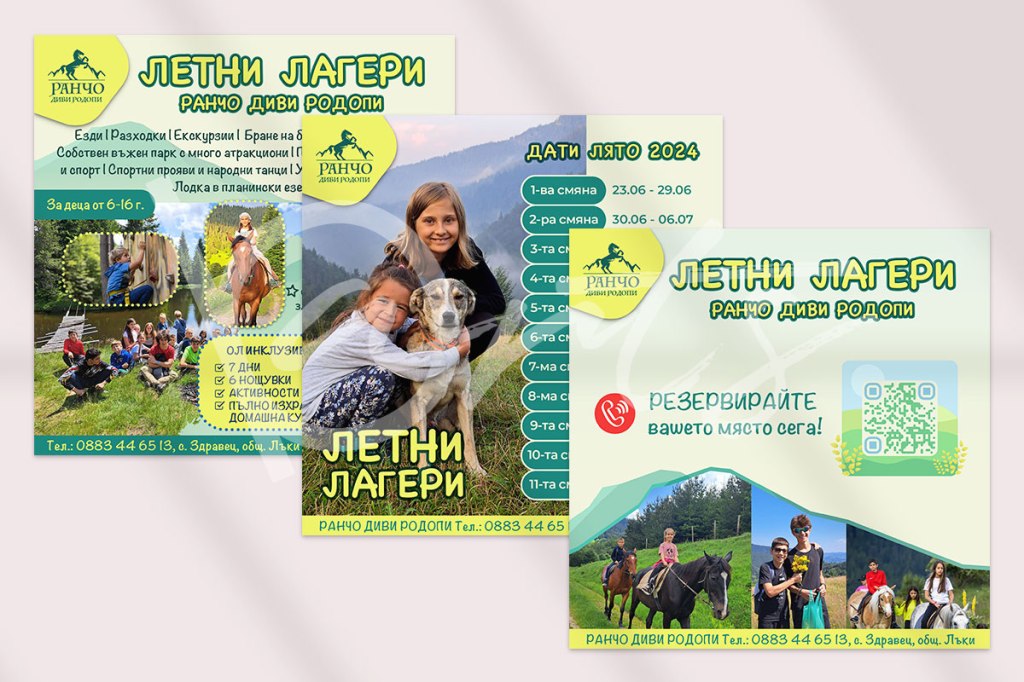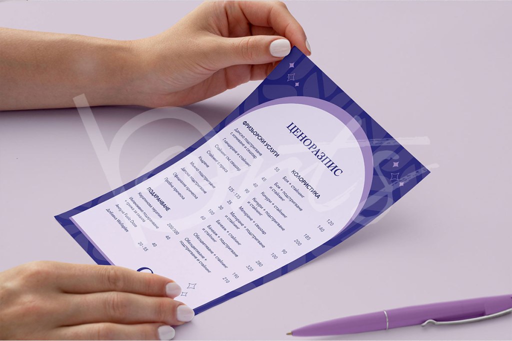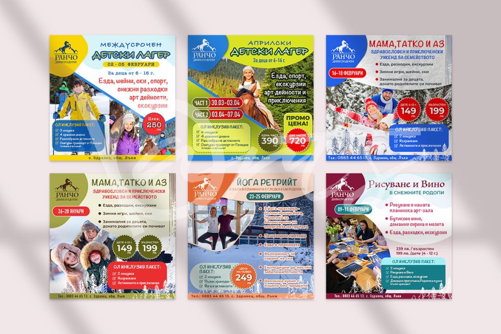 - Брандирани маркетингови и корпоративни материали: визитни картички, фирмена документация (бланки, папки, подписи за имейли), флаери, брошури, каталози, подаръчни ваучери, плакати, банери (онлайн и офлайн реклама), дизайн за социални медии (постове, корици, рекламни визии);